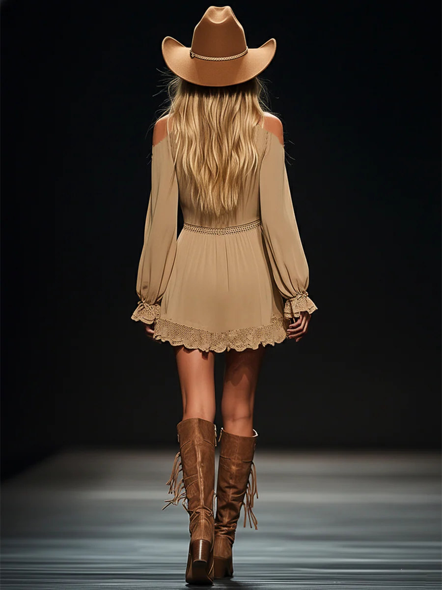 Bohemian Strapless Off-the-Shoulder Khaki Long Sleeve Mini Dress
