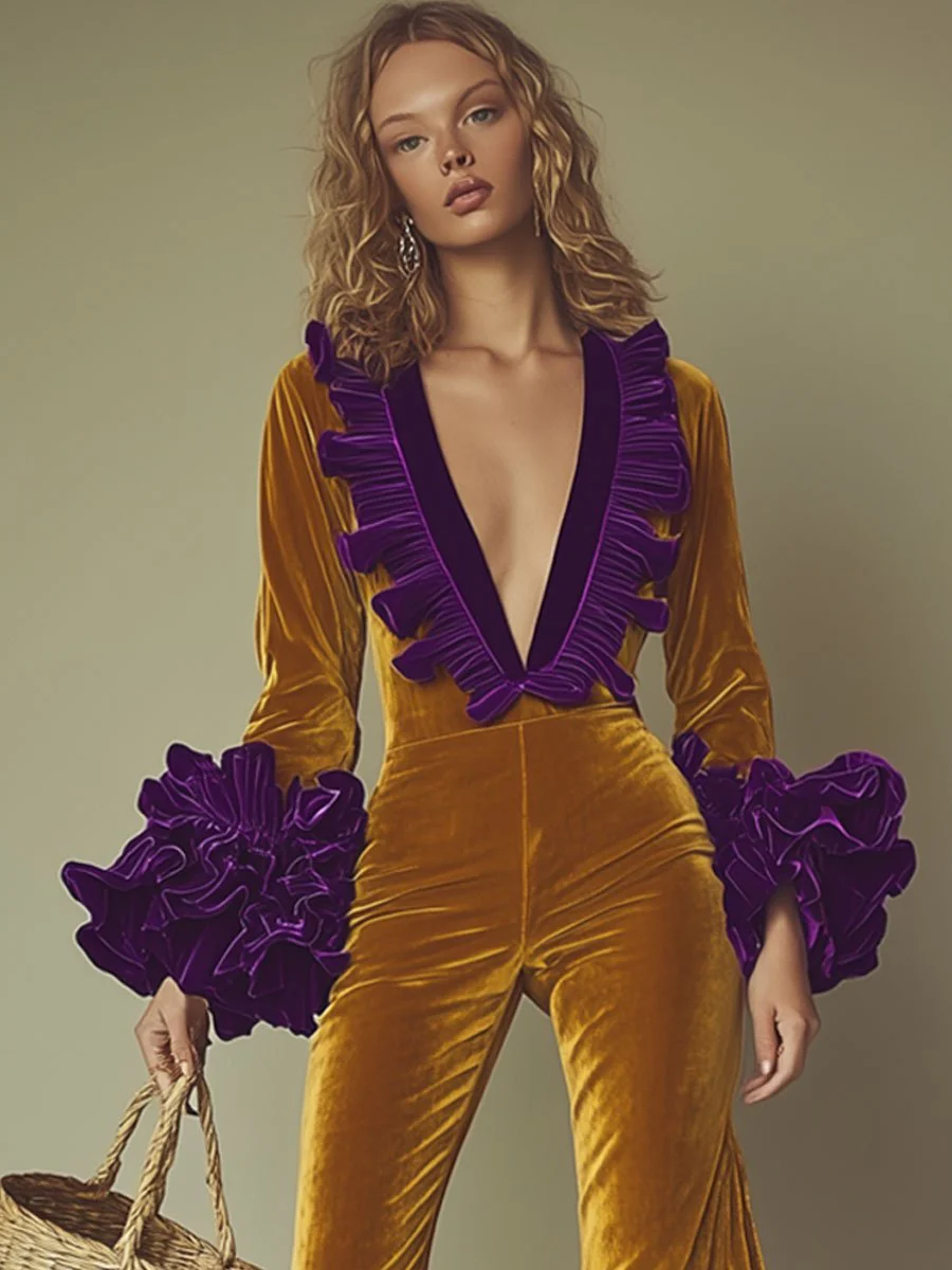 Make a statement at your next event with the Oyrosy Women's Fashion Party Purple Ruffle Long Sleeve Flared Gold Velvet Jumpsuit. Blending glamour, sophistication and playful drama, this jumpsuit is designed to catch people's eyes and leave a lasting impression. Perfect for a night out, a chic party or a special celebration, this luxurious velvet jumpsuit is the epitome of bold and fashionable style.