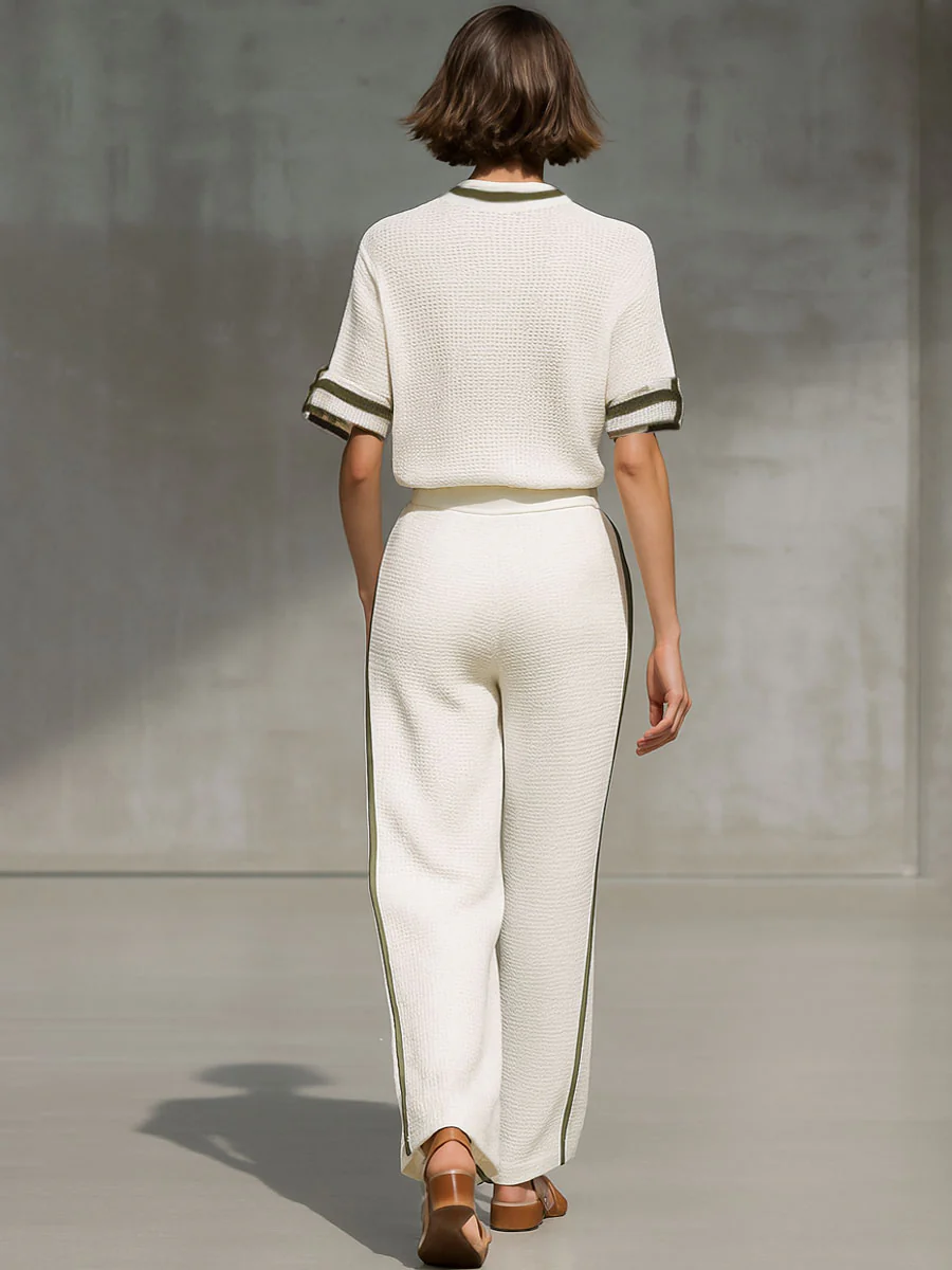 Vintage-Trimmed White Knitted Mesh Short-Sleeved Shirt And Wide-Leg Pants Set